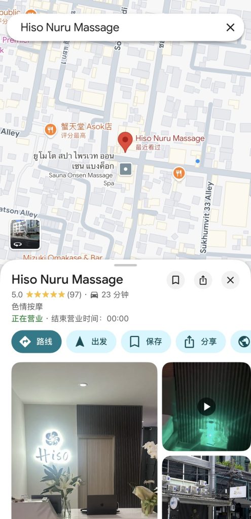 位置很方便,位于曼谷市区soi 31巷,google地图搜索:Hiso Nuru Massage,即可自行前往,一般推荐使用打车软件grab或者bolt最方便。
