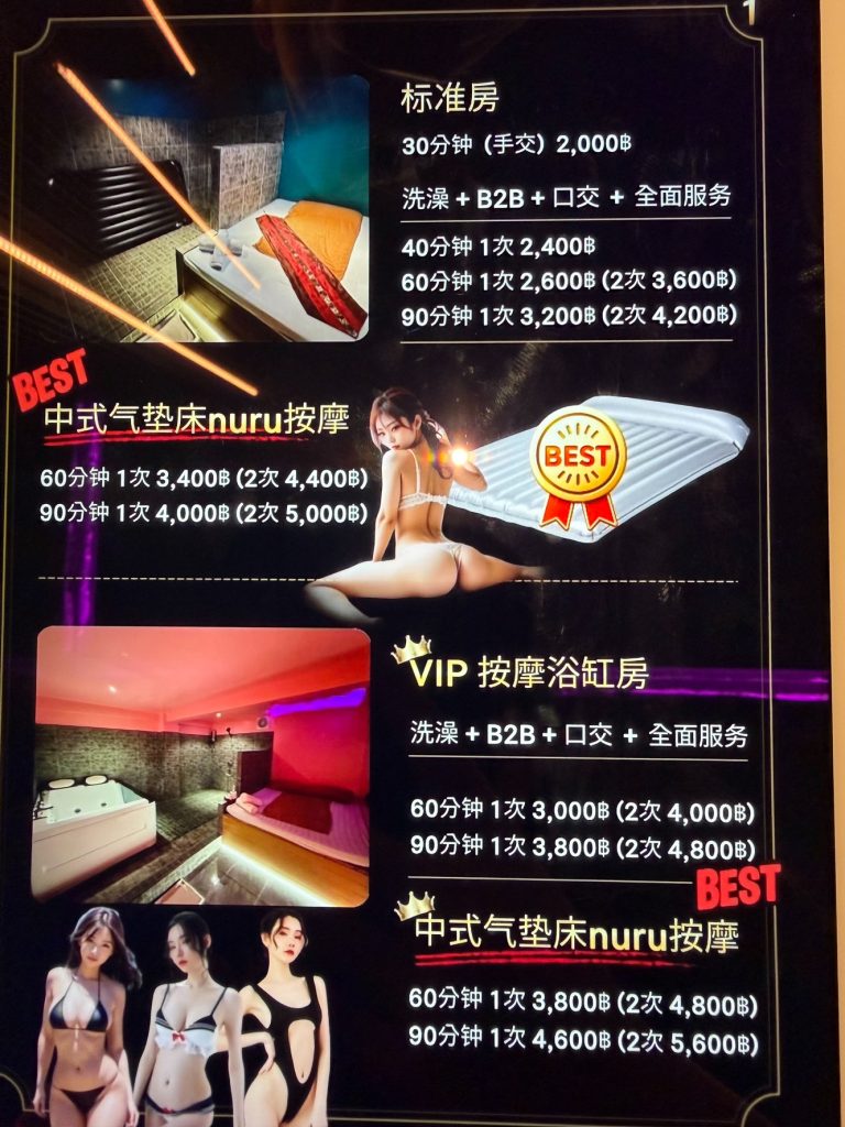 价格如上图所示,一如既往的推荐大家选择vip房是最好的,因为有浴缸,同等服务下就只贵了几百泰铢而已。因为浴缸房,房间也更大,按摩浴缸还可以上下双重夹击。
