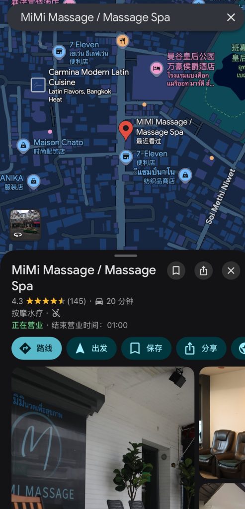 素坤逸22巷无须多言,位于曼谷的市中心地带,google地图搜索:MiMi Massage spa。使用打车软件grab或者bolt即可前往。开车前往的兄弟可以停到不远处的makro,一般来说那里停车都不收停车费